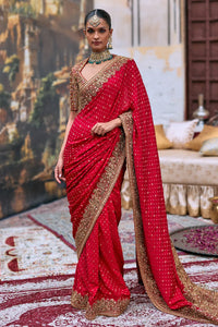 Red crepe saree with an intricate border and palla paired with red raw silk embroidered blouse.