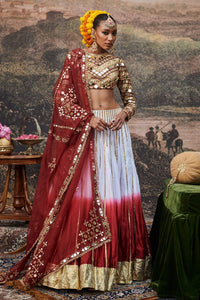 Ombre lehenga showcases a gradient effect, enhanced by a delicate gotta border and vertical gotta stripes on lehenga it is paired with a velvet mirror work blouse and a soft organza dupatta with mirror work on it.