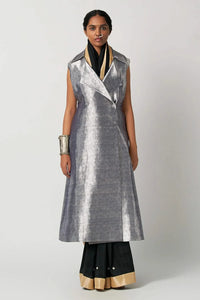 Layered with the Sapphire Empress Coat, the ensemble transforms into a statement of regal modernity. The sleeveless, long brocade jacket , handwoven in luxurious silk brocade , merges traditional richness with the contemporary edge of a trench-inspired silhouette. Versatile and effortlessly elegant, it can be draped over a saree for a majestic festive look or styled with modern separates for an Indo-Western statement.