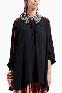 Discover the allure of Surmai Mandala Embroidered Collar Shirt. the solid-print free size shirt, crafted from natural crepe, boasts an embroidered collar with intricate zari marodi detailing. Embrace the anti-fit design and elegance.