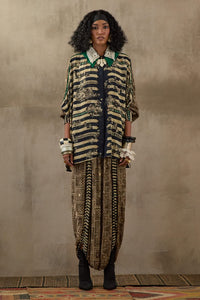 The Surmai Mogra Mural Mandala Shirt with Skirt Set features a trapeze printed shirt with an embroidered collar, paired with a printed draped trouser. The shirt offers an anti-fit design with no armholes, while the trouser provides a relaxed fit with an elasticated waist, ensuring comfort and style for all sizes.