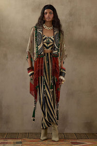 The Surmai Mogra Mural Veni Dupatta Jacket Set features a geometrical blouse paired with printed draped trousers and a printed, embroidered veni dupatta jacket. Adorned with resham thread embroidery, M.O.P. beads, and tassel details, the set includes a body-fitted blouse, waist-elasticated trousers, and an anti-fit jacket, offering a stylish contrast of fitted and relaxed fits for ultimate comfort and elegance.