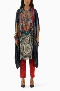 Discover elegance in the Surmai Ritu Kaftan and Trouser Set. The easy-fit tunic in natural crepe features an ambi print, embroidered yoke with tribal tassel details, and seam inserts. Paired harmoniously with printed narrow trousers in satin linen for a Slim Fit. Resham Thread Embroidery adds sophistication.