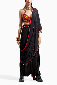 Experience grace with Surmai Sadhavi Drape Saree. Made from natural crepe, its relaxed fit features a stripe print and tribal tassel detailing on the pallu.