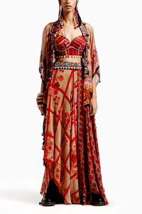 Elevate your look with the Veni Dupatta Jacket Palazzo Set. It features a printed corset blouse with embroidery highlight paired with printed plazzo set and dupatta.