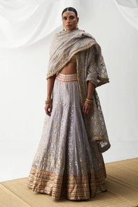 Featuring Surmayi Lilac Lehenga Set by ITRH's Sona Chandi Collection, this Set includes a silver lampi blouse paired with a soothing lilac lehenga, intricately embroidered with gota patti. The look is completed with a matching dupatta, edged with kiran, adding a refined and elegant touch.