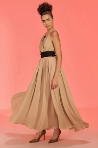 Featuring the Suzi Beige Dress by Chilosophy's Queendom Collection. This sultry, mid-calf length georgette dress features a satin top subtly embellished with rhinestones. Adjustable shoulder ties, a quilted satin waistbelt, and contrast detailing complete this chic, rock-and-roll look.
