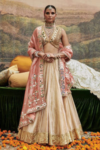 Beige-gold tissue lehenga features delicate lampi border, paired with a mirror work blouse on gota lined with chanderi silk, the look is completed with a mirror tissue dupatta.