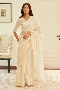The Swan Embroidered Saree is gracefully detailed with tone-on-tone floral embroidery that flows with quiet elegance. It is paired with a matching blouse adorned in delicate floral motifs. This saree comes with an unstitched blouse piece.