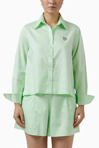 Elevate your wardrobe with this elegant lime green swarovski heart crop shirt set, crafted from ultra-soft pima cotton. The relaxed-fit crop shirt features a classic collar, full sleeves, and a stunning Swarovski pearl heart embellishment for a touch of glamour. Paired with comfortable elastic-waist shorts with side pockets, this set effortlessly blends luxury with ease.