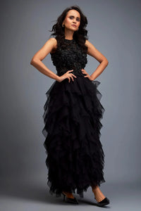An elegant black gown featuring a high neckline, adorned with intricate Swarovski beadwork on a sheer, sculpted bodice. The design is completed with a voluminous tulle skirt, creating a stunning, layered effect that exudes sophistication and glamour.