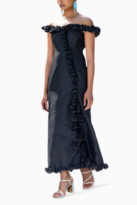 Featuring Sway Midnight Black Dress by Malie. This statement dress have a voluminous ruffle detailing detailing all over the edge with slit design that starts just above knee. It is fitted bust and waist and slighlty A line below waist to hem.