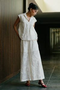 Featuring the Sway Organza Beadwork Co-ord Set by Trisara's Fuss Over Me Collection. This cream beige ensemble in cotton organza showcases self-embroidery, delicate sequin and bead detailing, paired with a straight-fit top and wide-leg pants for timeless sophistication.