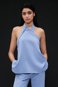 Swing top with halter neckline and front button closure.Perfect for both day-to-evening wear, pairing effortlessly with tailored pants or skirts for a refined, modern look.