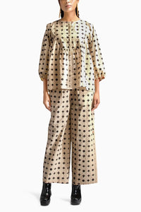 Swing cord- Billowy fit button down shirt blouse with voluminous sleeves in our original hand block printed crisp cotton . Highlighted with care carrying our signature handwork in golden thread detail to amuse the wearer. Paired with complimenting bllock printed relaxed fit trouser finished with intriguing button cross details.