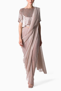 The Pari Net Sari is a pre draped sari but gives the look of a traditional normal sari. Made in shimmer net, it is fuss free and really light to wear. With a built in petticoat, the pallu gets attached to the waist with the clever use of a snap button and stays on while you are on the move. Pair it with our embellished Swing Top that is fun and moves with you.