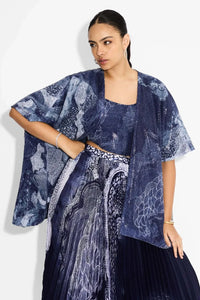 Featuring SHA Swirl Blue Sequin Coverup by Shasha Gaba, this obsidian blue shrug is crafted from transparent poly sequin fabric. Perfect for pret wear, its swirl design adds a sparkling Indo Western touch, making it ideal for layering over festive and contemporary outfits.