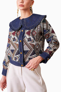 A beautiful mix of jacquard and denim, this jacket with a sailor collar is luxurious yet effortless for your winter wardrobe
