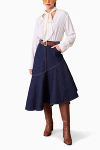 This diagonal ruffle-hemmed dark blue denim skirt adds a touch of feminine flair while creating a layered look for your season's wardrobe, perfect to pair with chic knits.