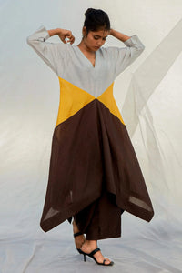 A fuss free color block V-neck tunic. Silver, brown and yellow on this A-line cut top which has pockets. Paired with pants.