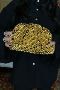 She’s bold, filled with rhythm and unapologetically festive. With all eyes and ears always on her, she’s the Taal Bobbi Bag. You’re going to want to wear her often, feel the texture and weight of the thousands of ghungroo that deck its black silk velvet, and hear the beautiful sound they together create. This shell-shaped clutch is a 360-degree sensorial experience. It comes with a tonal velvet strap that doesn’t dig into the skin, and its lined interior fits every essential.