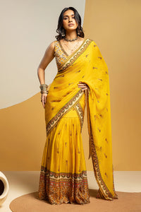 Featuring a yellow Taarani embellished pre-stitched saree in organza, paired with a V-neck blouse in silk. A graceful silhouette that combines effortless draping with refined elegance.