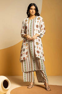 Featuring an off-white Taarani printed kurta and pants, paired with a crepe embellished jacket. A graceful blend of tradition and modern elegance.