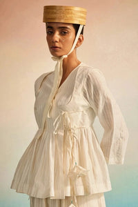 A contemporary take on a classic silhouette, the Tabaneru Angrakhi is crafted in hand screenprinted Chanderi. The Angrakhi is elevated with an intricately appliquyoke at the back and delicate 3D origami flowers at the tieups adding a playful yet refined charm. Its lightness and detailing make it perfect for both everyday elegance and thoughtful occasion dressing.