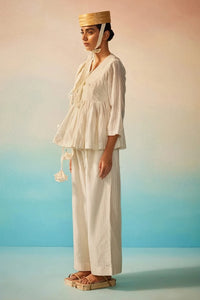A playful yet refined set featuring the Tabaneru Angrakhi in hand screenprinted Chanderi, detailed with 3D origami flowers and an appliqud back yoke. Paired with Hama Akari Stripe Pants, the set flows with lightness and charm perfect for thoughtful everyday dressing.