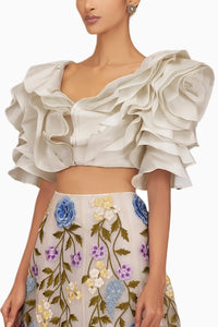 This ivory draped blouse is crafted from luxurious taffeta, featuring a wide neckline that enhances its elegant, flowing silhouette, making it a versatile and sophisticated addition to any wardrobe.