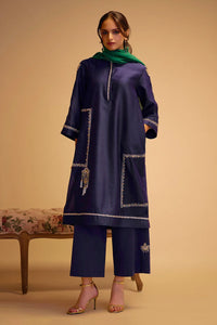 Featuring intricate stonework embroidery, the Tahira kurta set boasts a classic silhouette ideal for festive occasions. Made from 100% chanderi with cotton satin pants, it includes a mandarin collar kurta and a contrasting chanderi scarf detailed with scalloped edges and embroidered patches for added elegance.