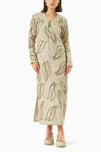 Minimalist and modern, the Tahira Dress is the perfect outfit for a full day of activity. Wear this garment to work and continue onwards for an evening with friends. Crafted using 100% linen, the dress features abstract embroidery and full sleeves.