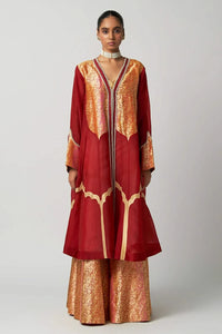 Crafted in hand-woven brocade with delicate tissue applique, the piece showcases artisanal mastery while offering a lightweight, luxurious drape.