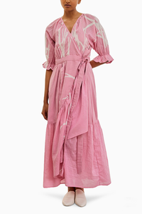 Featuring a pale pink lino print mulmul cotton knot wrap dress that comes with half sleeves.