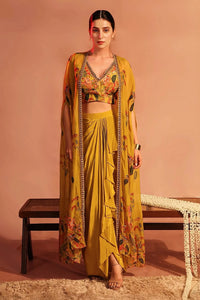 This striking ensemble features a yellow Tamaya embellished organza cape paired with an intricately embellished blouse in cotton silk. The delicate organza cape adds a layer of ethereal elegance, beautifully adorned with Tamaya detailing. The blouse, with its refined embellishments, perfectly complements the cape, offering a luxurious and modern touch. The look is completed with a draped skirt in crepe, which flows gracefully, creating a flattering silhouette.