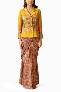 The Yellow Tamaya embellished jacket with a Cuban collar is crafted from luxurious Malaysian silk, showcasing exquisite detailing for a refined look. It is beautifully paired with a draped saree in crepe fabric, offering a graceful flow and elegant drape. This combination blends contemporary chic with classic tradition, making it perfect for festive occasions or evening events.