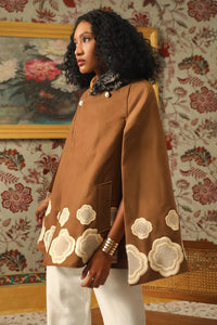 Beautifully crafted Honeycomb embroidered flowers and fur detailed collar. Our exclusive cape coat.