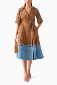 Discover the Melinda Tan Cotton Twill & Denim Color Block Wrap Dress, a beautiful blend of style and comfort. This eye-catching dress features intricate sea shell embroidery on the sleeves and hem, adding a whimsical touch. The wrap-style design includes a denim color block at the hem with elegant pleats, an elasticated waist for a flattering fit, and convenient side pockets. With elbow sleeves and a fit-and-flare silhouette, this dress is perfect for any occasion, combining elegance with effortless charm.