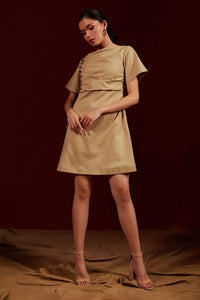 The shift dress—a silhoutte that’s flattering on all body types—gets a tara and i twist with horizontal folds across the chest and lustrous gold buttons. Pair this with a pair of stilletoes for your next boardroom meeting