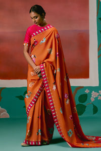 A vibrant ode to color, this saree is set on a bold tangerine base with fuschia florals that create a striking contrast. The pallu is detailed with intricate beaded hangings, making it perfect for celebratory evenings where statement dressing is key.