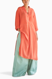 In a beautiful shade of coral this tunic is made from lightweight cotton. Side slits and a shawl v neck. Could easily be belted for an elevated look or taken out as a kurta in the sun. Paired with dramatic flared pants in a gorgeous sea shade in cotton. Classic button and zip fastening in the front and side pockets. If there is one thing you pick from number 6 make it this one. The color and the style shall never fail you.