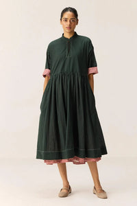 Featuring a dark green cotton mul base, this dress is accented with contrasting red and white printed mul along the sleeves and hem, creating a playful peekaboo effect. White running stitches highlight the neckline and bottom hem, adding delicate detail. Fully lined and finished with side seam pockets for everyday ease.