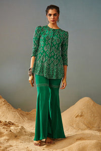 This emerald green jacket-style set features intricate beadwork throughout the fabric, creating a bold geometric pattern. The jacket has a structured silhouette, accentuated with 3/4th sleeves, making it perfect for festive occasions. Paired with wide-leg sharara pants, this ensemble exudes a modern and powerful look, ideal for a statement entrance.