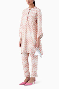 Discover elegance with Tansy Ivory Boota Print ensemble. Crafted from exquisite Chanderi fabric, this 2-piece set features lace work pants and stylish slash-cut sleeves, perfect for adding a touch of sophistication to your wardrobe.