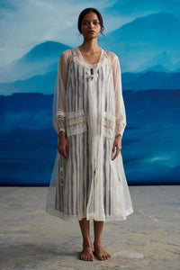 Fashioned from luxurious silk organza, this captivating statement garment offers a delightful sensation against your skin, gracefully cascading with each step you take. Adorned with intricate lace detailing and a front tie-up featuring handmade tassels, this piece exudes sophistication and elevates your style effortlessly. The addition of lace pockets and a printed cotton slip adds a beautiful finishing touch, ensuring that every angle reveals a new detail to love. Step into everyday glamour with this stunning design, where each wear is a celebration of elegance and style.