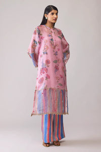Featuring a celebration of colour and craftsmanship, this floral printed kurta set is crafted in delicate organza with a dreamy, sheer finish. The straight kurta is accented with fine gold lace and vibrant hand-embroidered details on striped organza, adding a playful twist. Paired with a shantoon slip and cotton satin pants, this lightweight set is perfect for summer festivities, intimate gatherings, or destination celebrations.