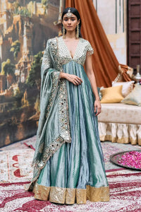 This is a teal blue and Sea Green tissue Anarkali with a hand-embroidered mirror work yoke. It’s paired with a matching Sea Green tissue dupatta featuring intricate hand-embroidered mirror detailing.