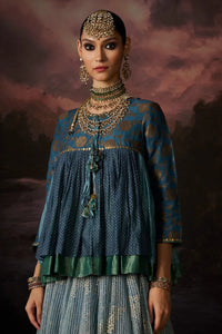 Featuring Tashi Shades of Blue Kedia Top by Swatti Kapoor's Firdaus collection, this handcrafted piece combines Muga silk, Chanderi, and zari stripes. Adorned with gold foil printing, beaded embellishments, and upcycled katran tassels for a timeless, artistic appeal.