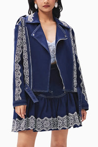 Rev up your style with this Tasya Blue & White Jacket. Crafted from denim, it fuses dark wash thread embroidery biker denim jacket, perfect for a bold fashion statement.