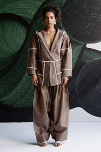 Featuring a structured, deep plunge blazer with white pearl embroidered lines to create a panelled effect, paired with matching volumnous pleated trousers, this ensemble is crafted in silk chanderi and designed in a shift silhouette with a relaxed fit, finished elegantly with a v neck for a refined and contemporary look.